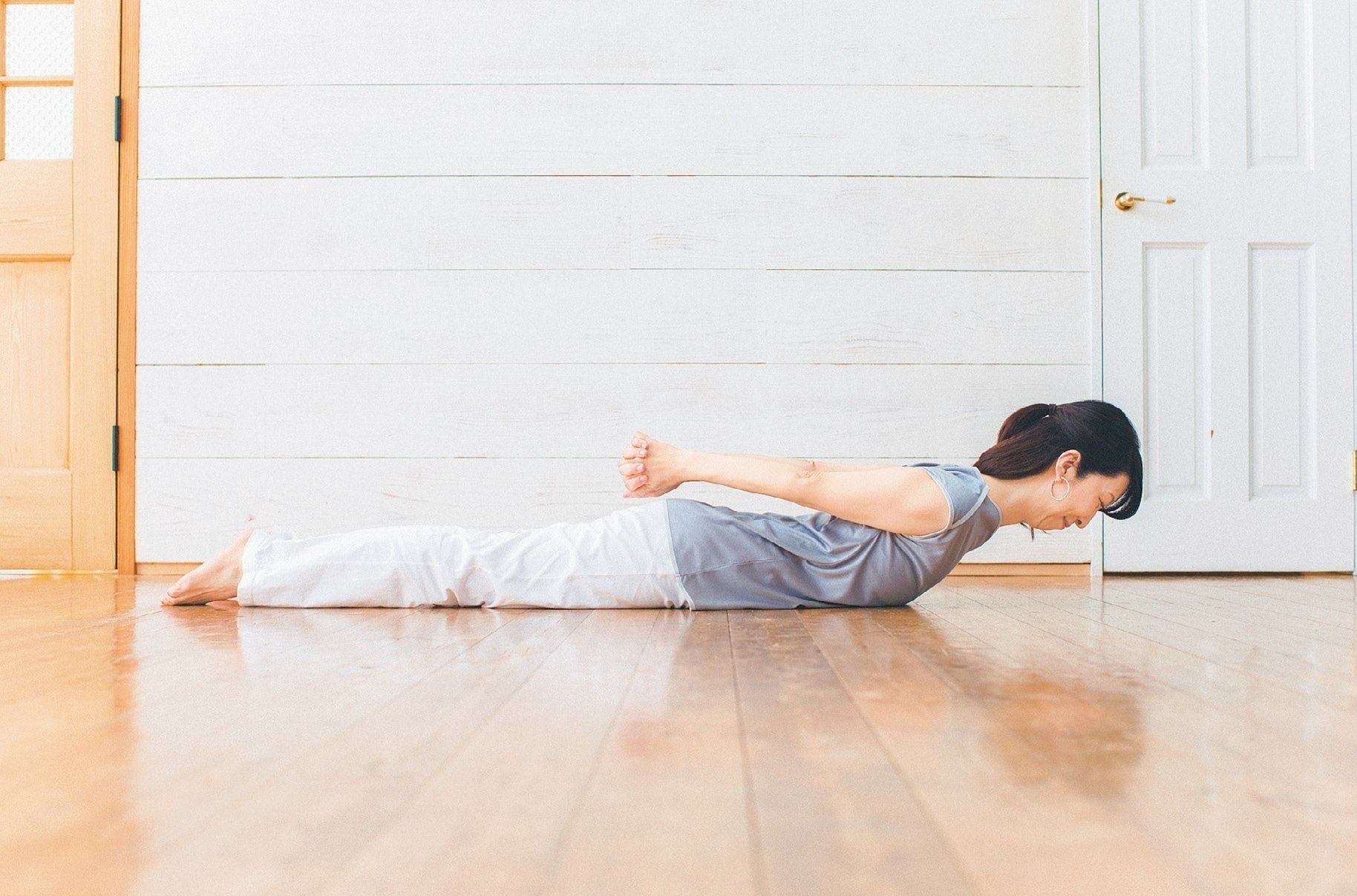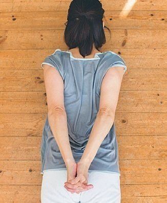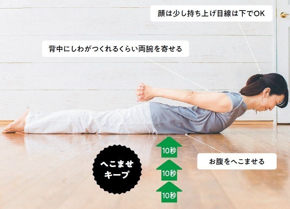 腹ばいになり、体の後ろで手を組んで伸ばします。シャツに縦じわをたくさんつくるイメージで肩甲骨どうしをグッと寄せ、お腹全体を引っこめながら上半身を軽く起こして基本のへこませのように30秒キープ。腰が弱い人は、上半身を高く上げなくてもかまいません。