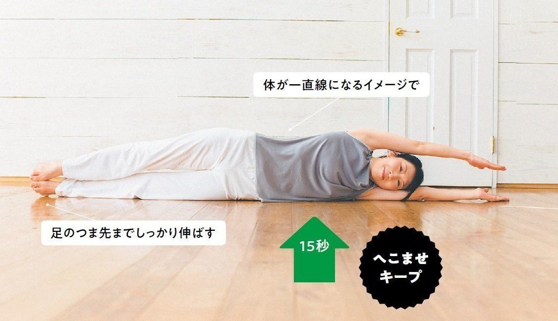 指先からつま先までグッと伸ばし、お腹をできる限りへこませます。わき腹の筋肉だけを意識するのはむずかしいけれど、お腹全体をへこませていれば自然とわき腹にも効いてきます。右わき腹を上にして15秒、左わき腹を上にして15秒。