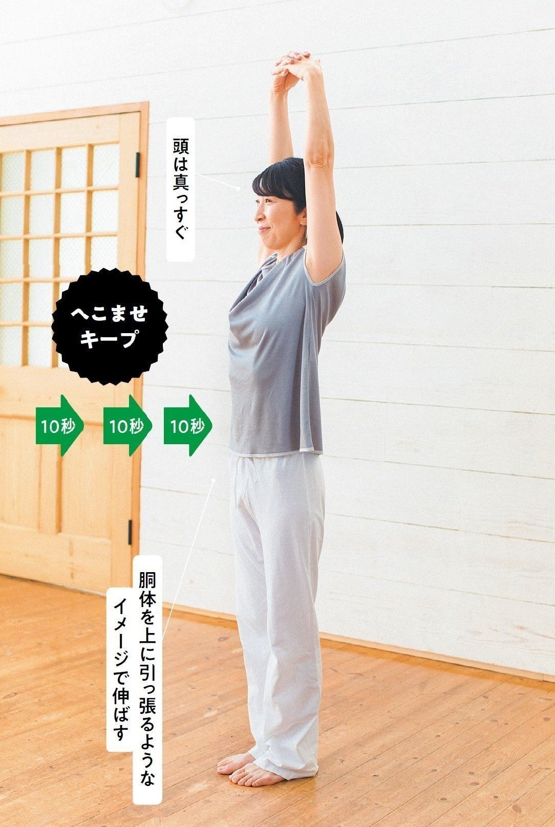 真っすぐ立ち、両手を組んで手のひらを上に伸ばします。頭を真っすぐに、胴体を上へ引っ張り、おへそと背中をくっつける!くらいのイメージでお腹をグッと引っ込め30秒。お腹に力を入れたまま、両手を下ろして肩の力を抜きましょう。
