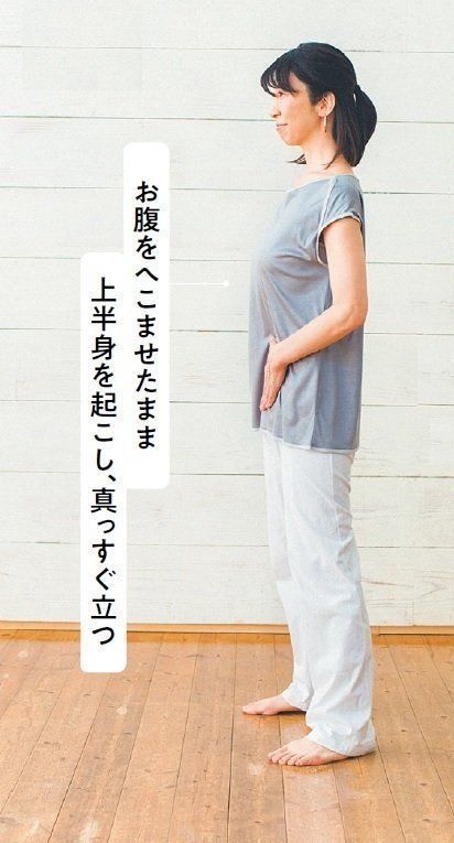 背すじを伸ばし、後頭部とかかとを壁につけて立ちます。肩を引いて、10秒かけてお腹を大きくへこませます。へこんだお腹を壁に押しつけるように、さらに10秒へこまし、最後の10秒でもっともっとへこませます。