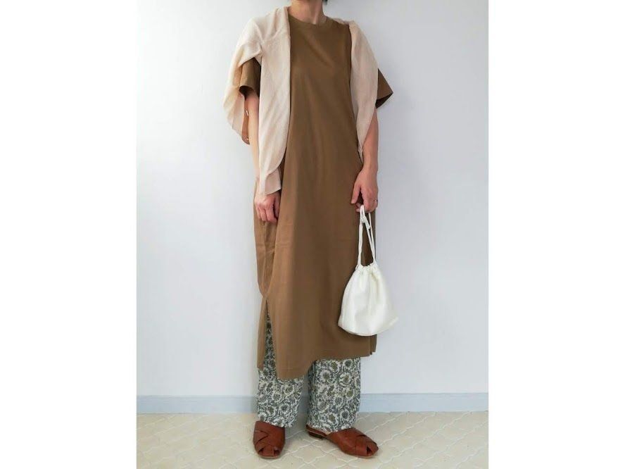 ロング丈ワンピースにパンツをレイヤードすると、トレンドの着こなしに。