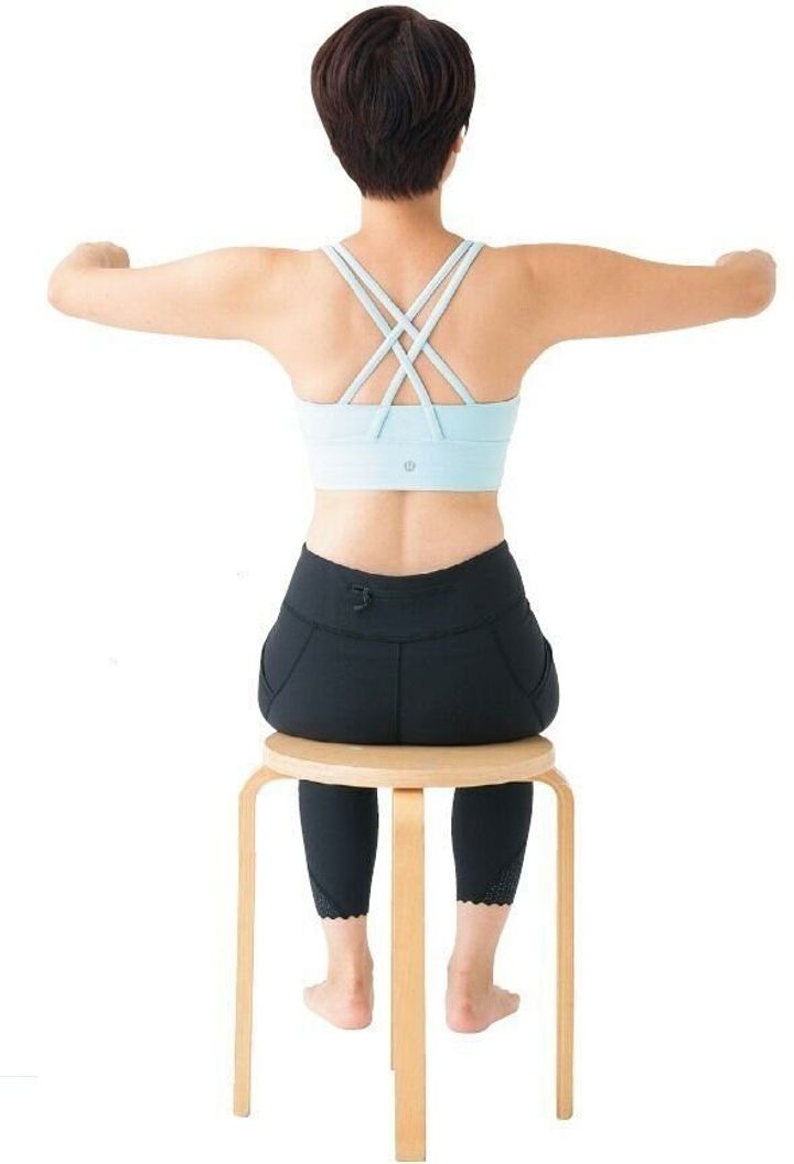 肩甲骨をのばすように3秒かけて左右のひじを近づける。このとき、ひじの高さが変わらないように注意。このひじの開きとじをていねいに10回行う。
