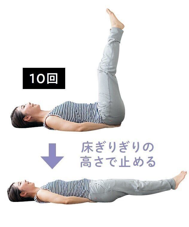 毎日添い寝して、おしゃべりしながら下の子2人を寝かしつけている水澤さん。「2人とも30分は寝ないので、その時間を有効活用して軽い筋トレをしています。おなかがへこんでお尻が上がりました」。特に下腹に効くのは右の写真の「レッグレイズ」。かなりハード!