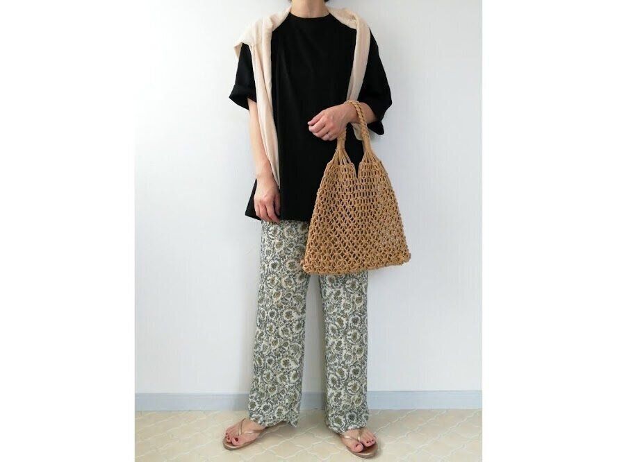 柄パンツやネットバッグ、ビーチサンダルでリゾートライクに。