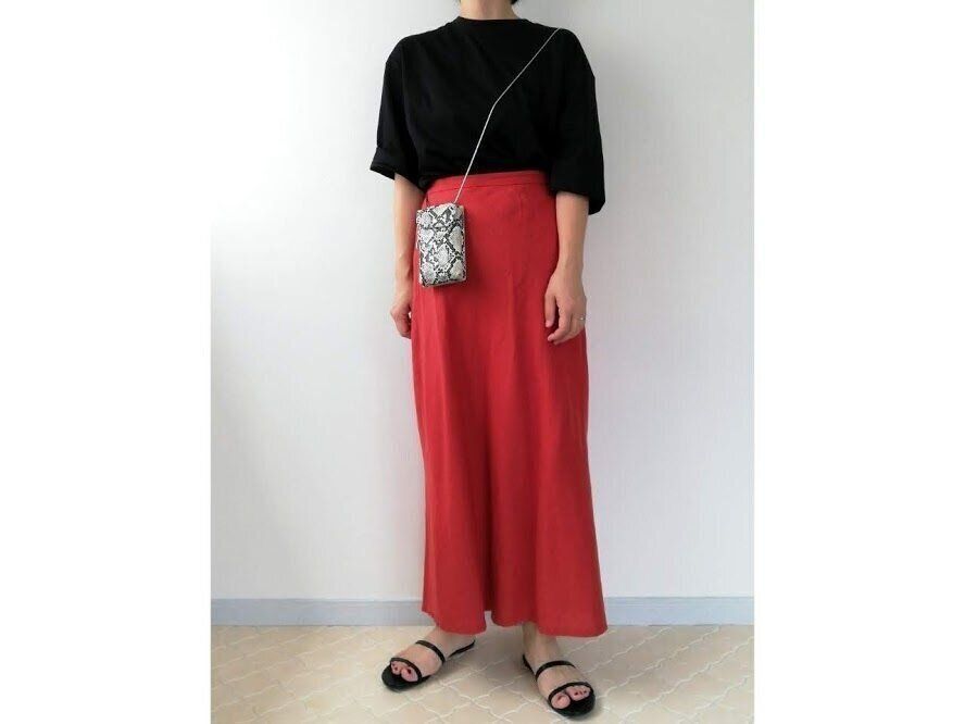 赤のロングスカートが目を引く、華やかなTシャツコーデ。