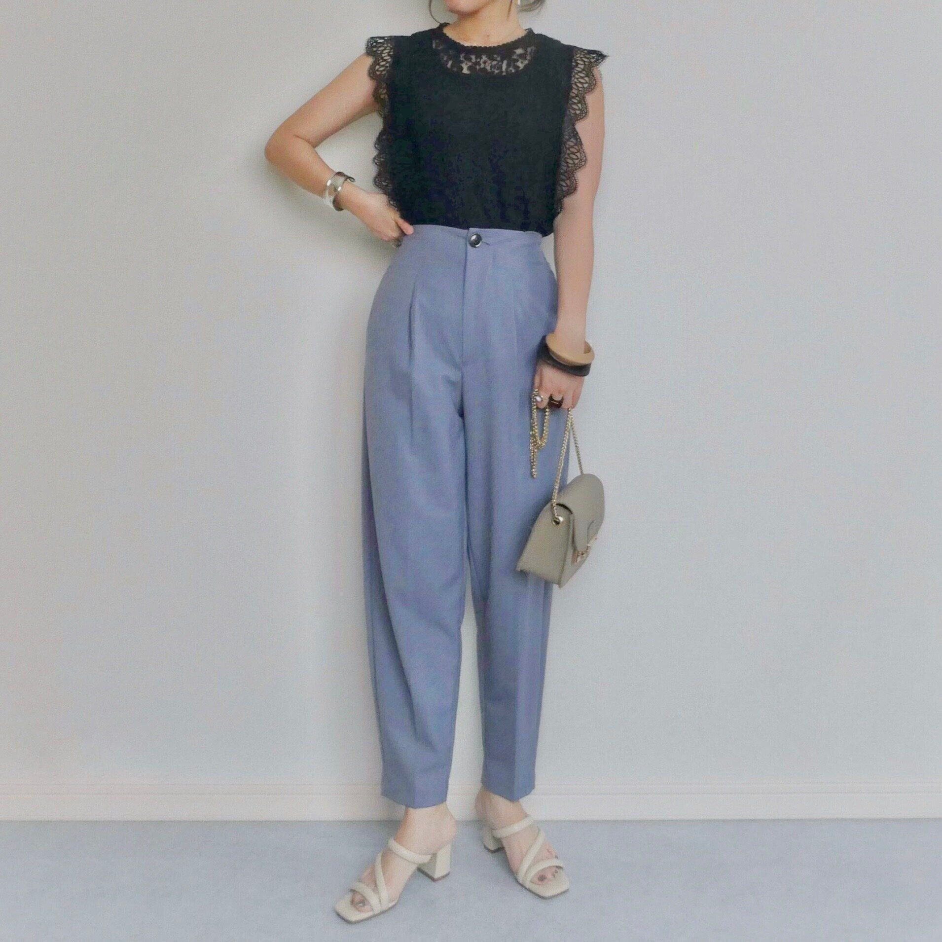 ノースリーブですが、腕まわりのレースのおかげで、二の腕の細見えを叶えてくれる嬉しいデザインです。