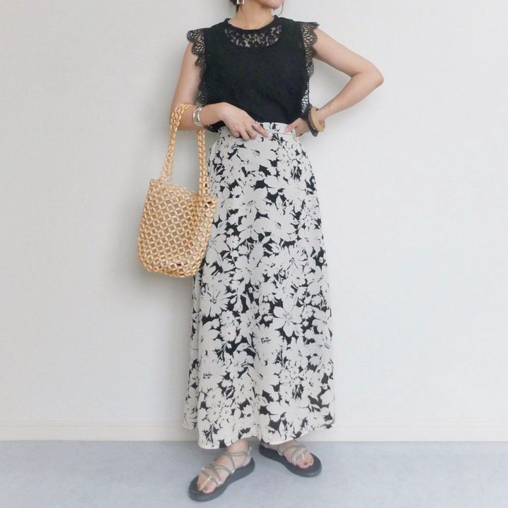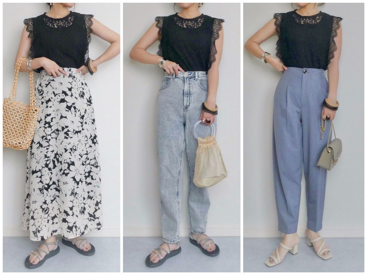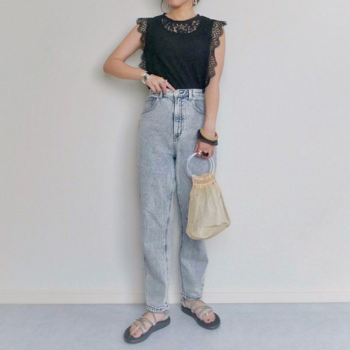 華やかなレースなのでデニムを合わせてもカジュアルになり過ぎず大人女子にもおすすめ◎。ハイウエストのボトムスを選んでインすれば脚長効果もバッチリです。