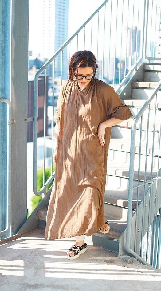 気になる下半身をカバーするワイドパンツは、重くなりすぎないよう、全身をあえて同じ色で統一。ワンピースは、中途半端な丈より、ふくらはぎまで隠れるほうがスッキリ若見えに。
