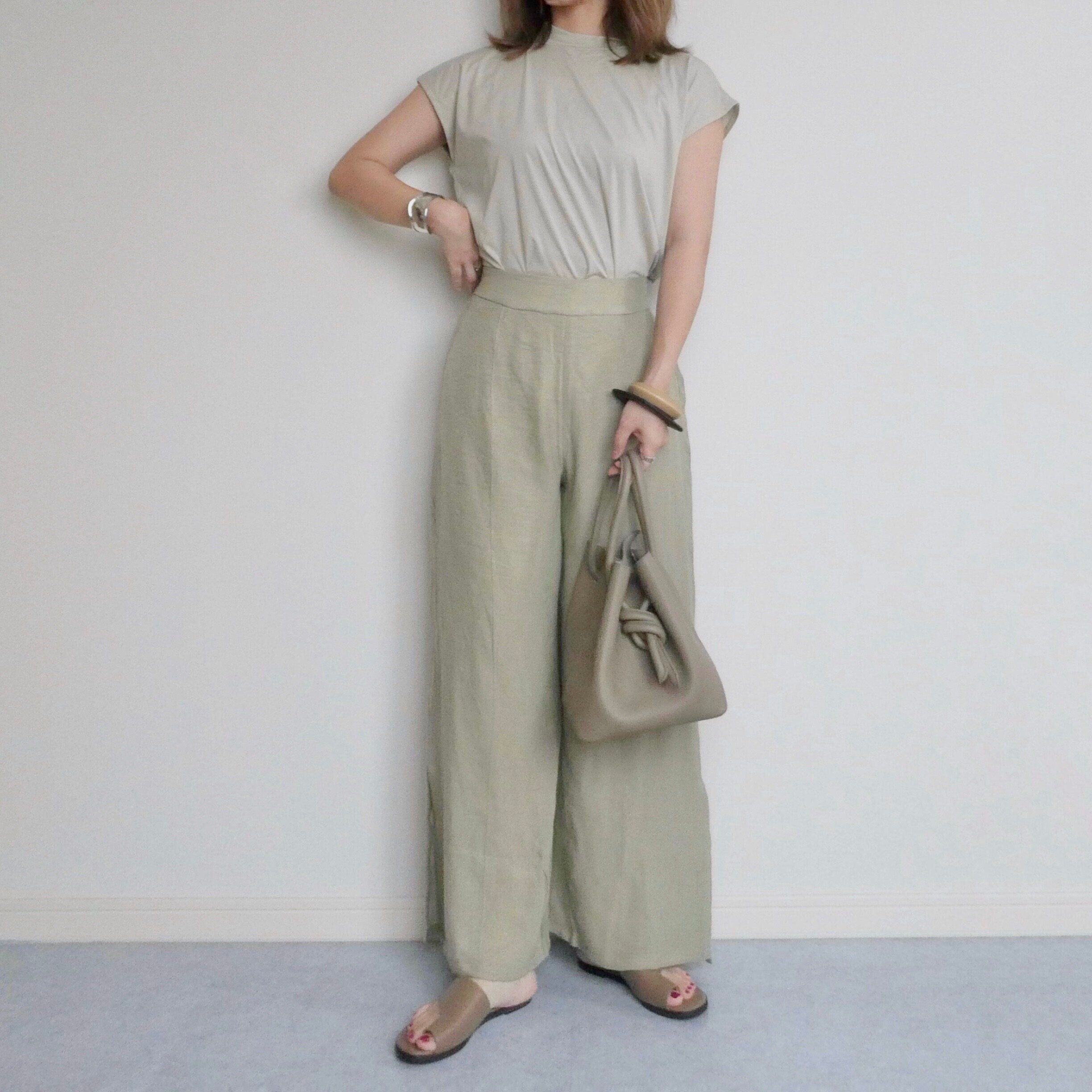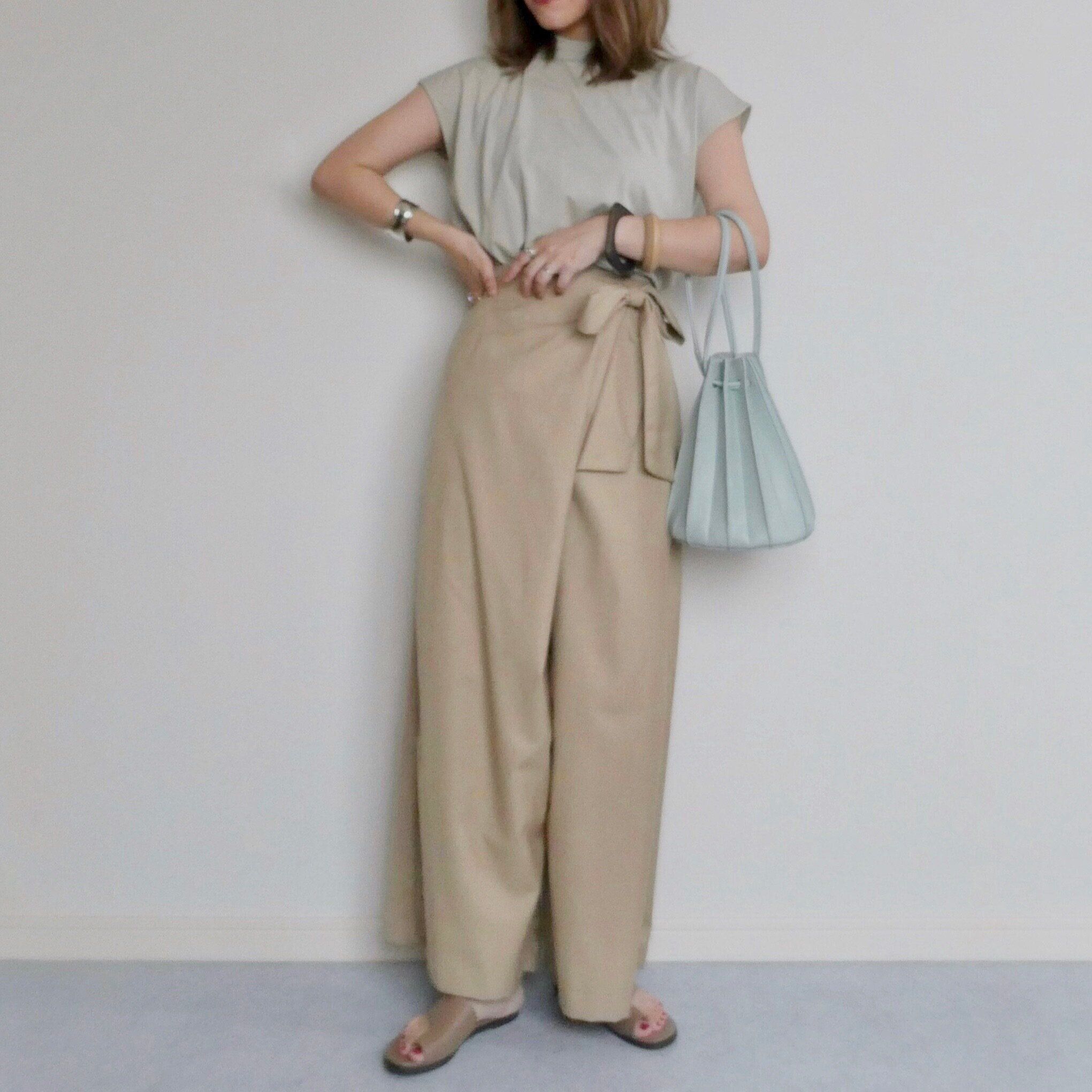 今年らしいラップデザインのパンツを選べばトレンドコーデの完成です。このトップスはフレンチスリーブになっているので二の腕の細見え効果も期待できますよ。