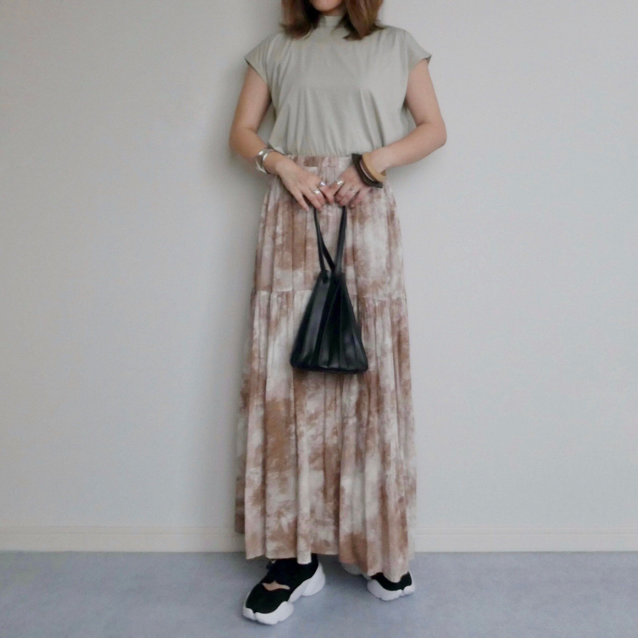 今年トレンドのタイダイ柄のスカートを合わせてトレンド満載のコーデに。一見難しそうなタイダイ柄もベージュを選べば取り入れやすくておすすめです。