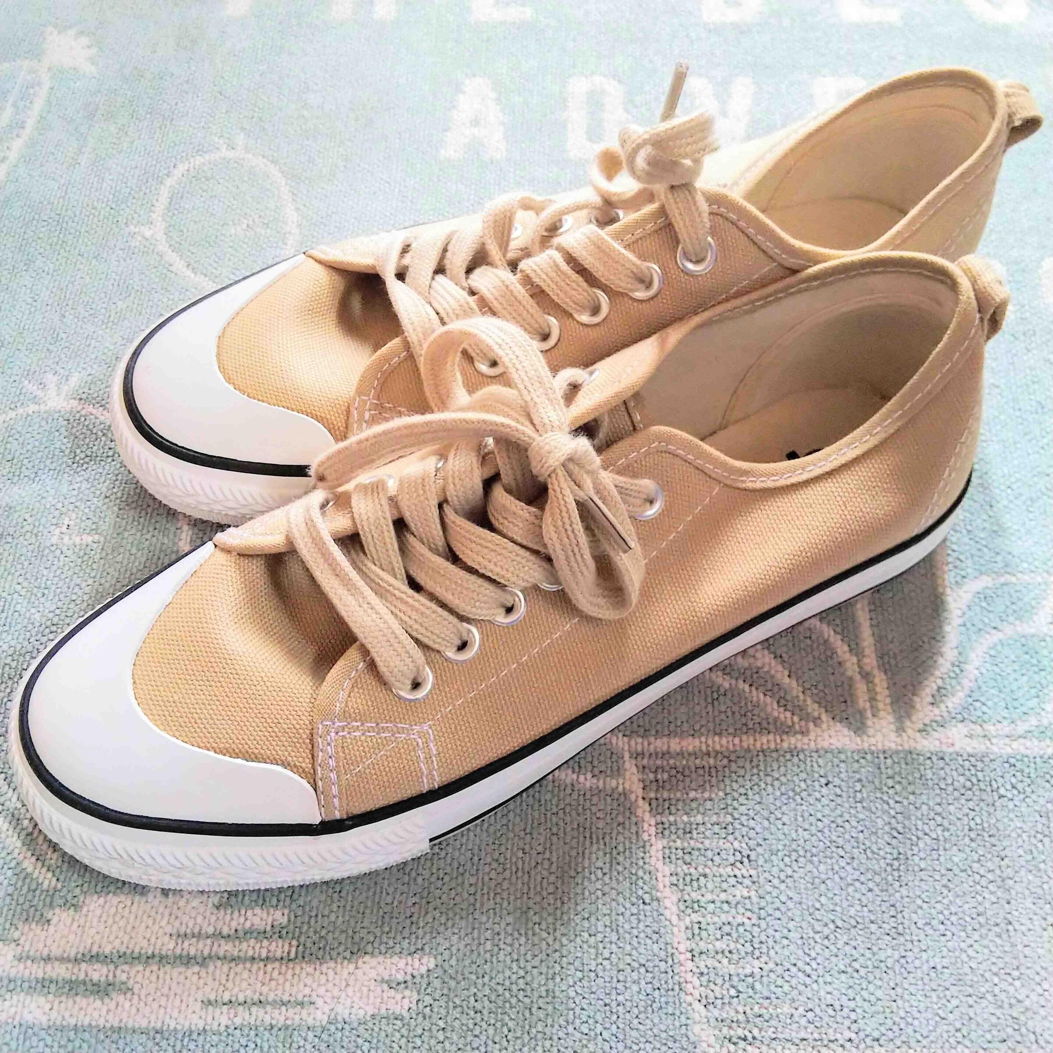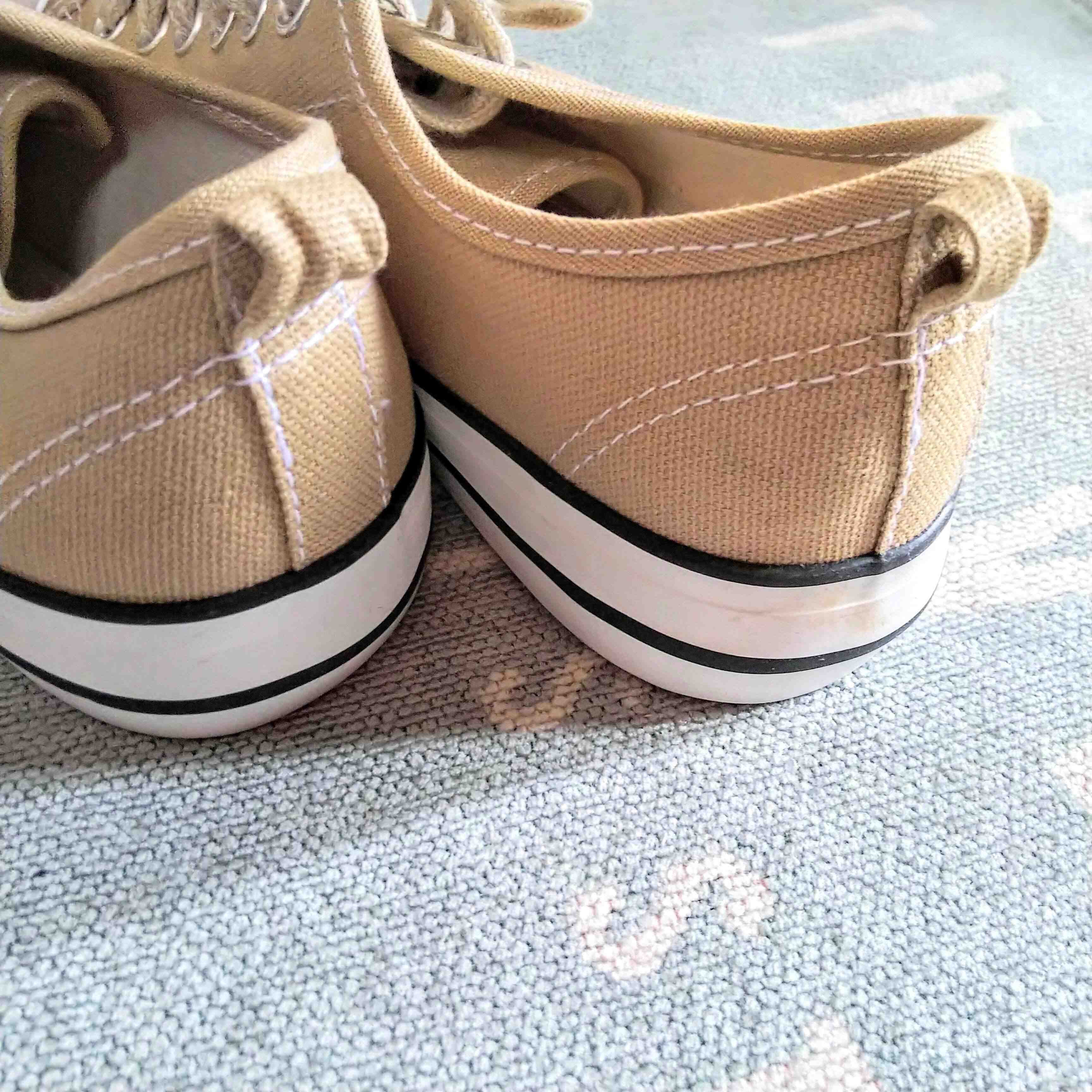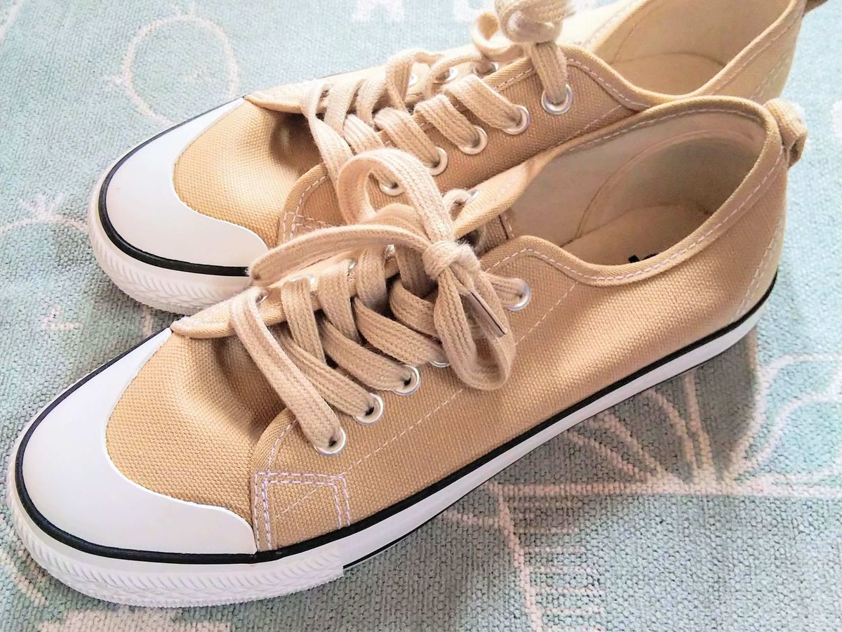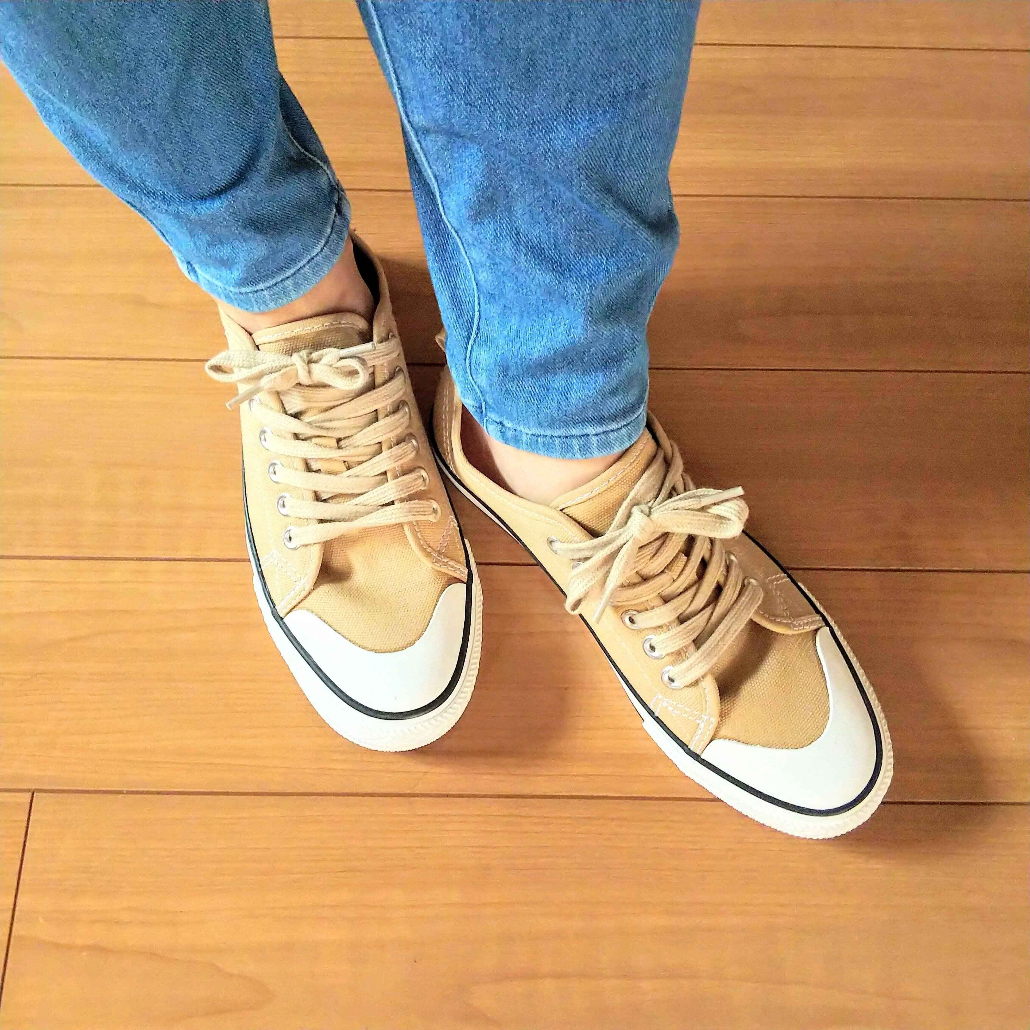 普段はTシャツにジーンズのスタイルが多い筆者ですが、ベージュのスニーカーがいい感じに合います。