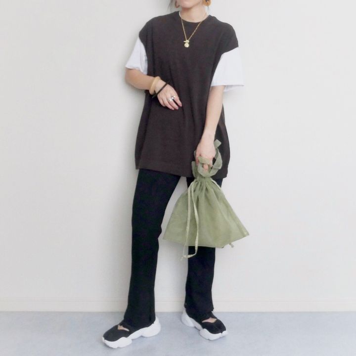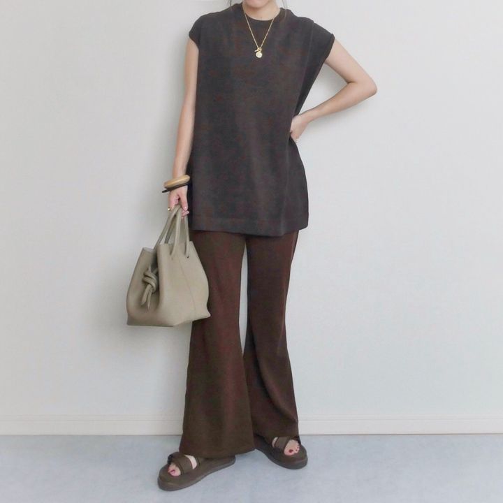 同じくブラウンのボトムスを合わせれば、トレンドのセットアップ風のコーデの完成です。