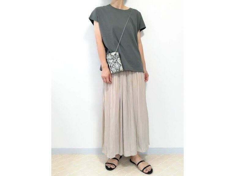 ロングスカートに合わせたシンプルカジュアルなコーデ。