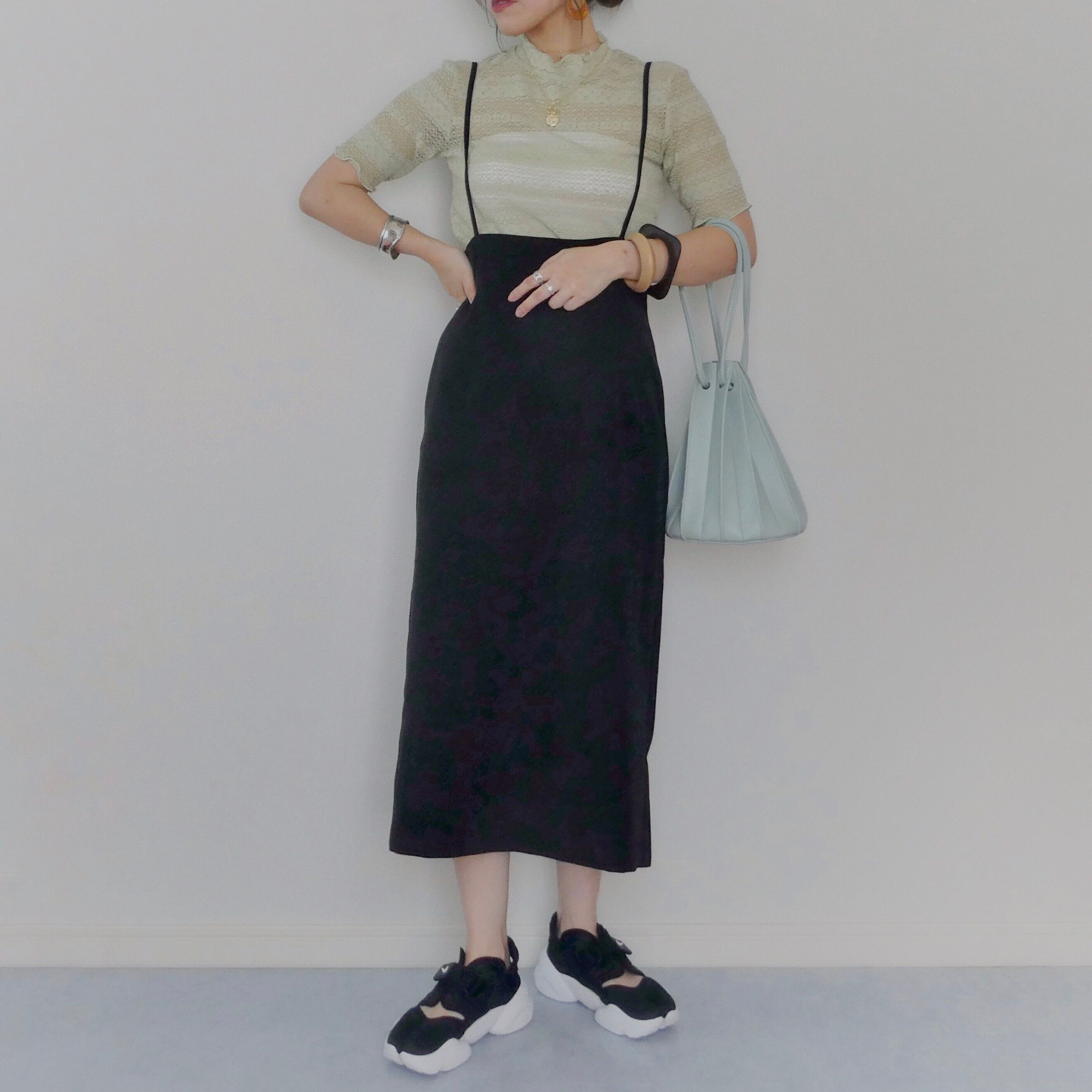 ストンとしたシルエットでオトナ女子にもおすすめの「サスペンダー付きナロースカート」をご紹介します。