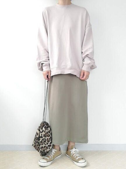 オーバーサイズのスウェット×ロングタイトスカート、漂う「ぬりかべ感」が否めません…!上下スウェット地なので、部屋着っぽさもありあか抜けない印象。トップスを変えるなら?