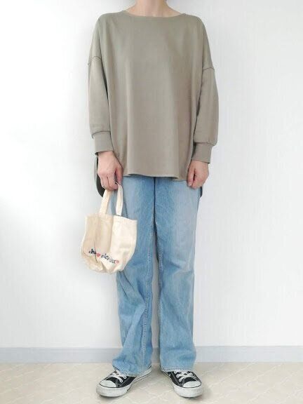 そのまま着るとこんな感じ。(160cmでLサイズ着用)だらっと「ルームウェア」ふうな印象が否めません…おしゃれに着こなすにはどうすれば?