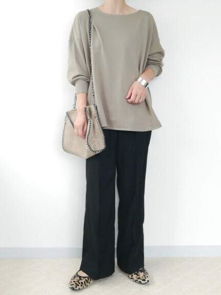 きちんと見える「スラックス」ならコーデにメリハリができて◎。引き締めカラーの黒スラックスなら、すっきり見せも叶えてくれます。レオパード柄パンプスで、大人の遊び心をプラス。