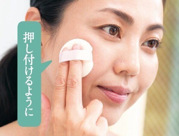色のつかない、ルースパウダーをチークに重ねて。頬骨に沿うように丸みを感じながら、プレスするように圧をかけてなじませることでチークの色落ちを防ぐ効果がアップ。