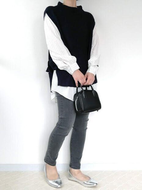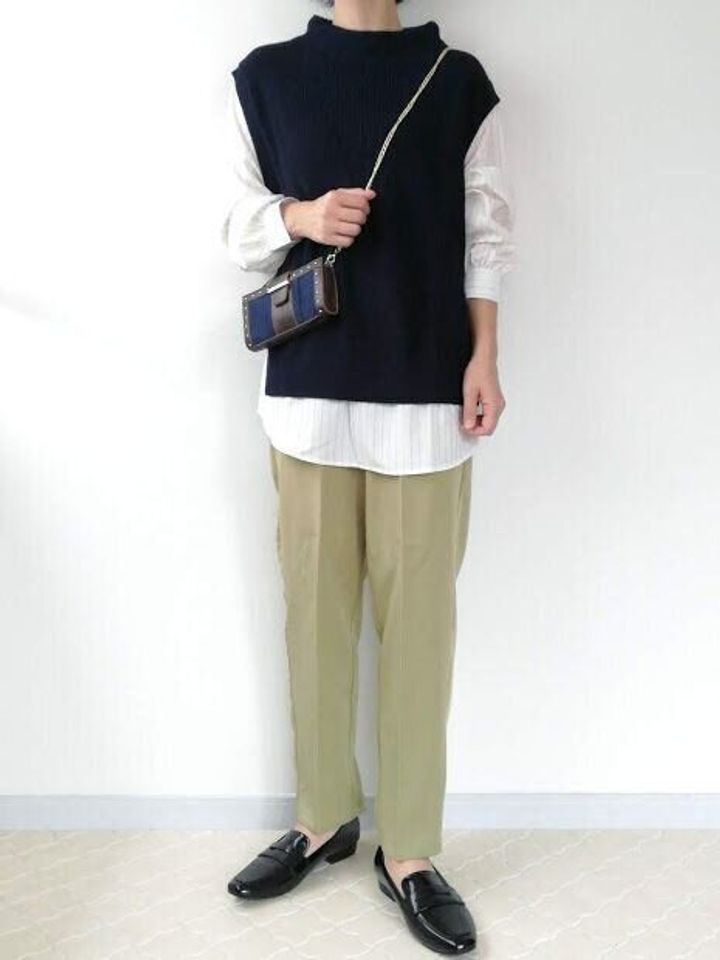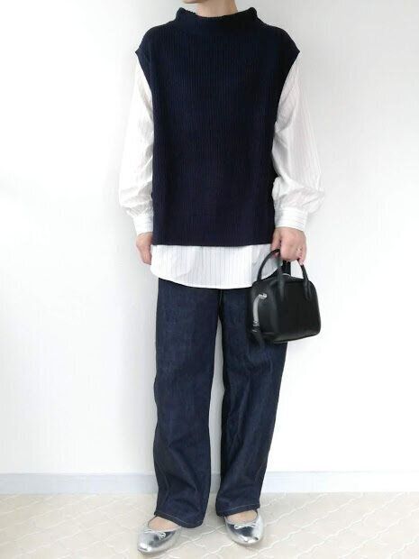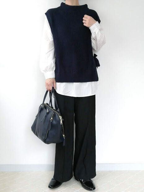 ネイビーのベストにブラックのワイドパンツで、全体的に重たくマジメな印象。