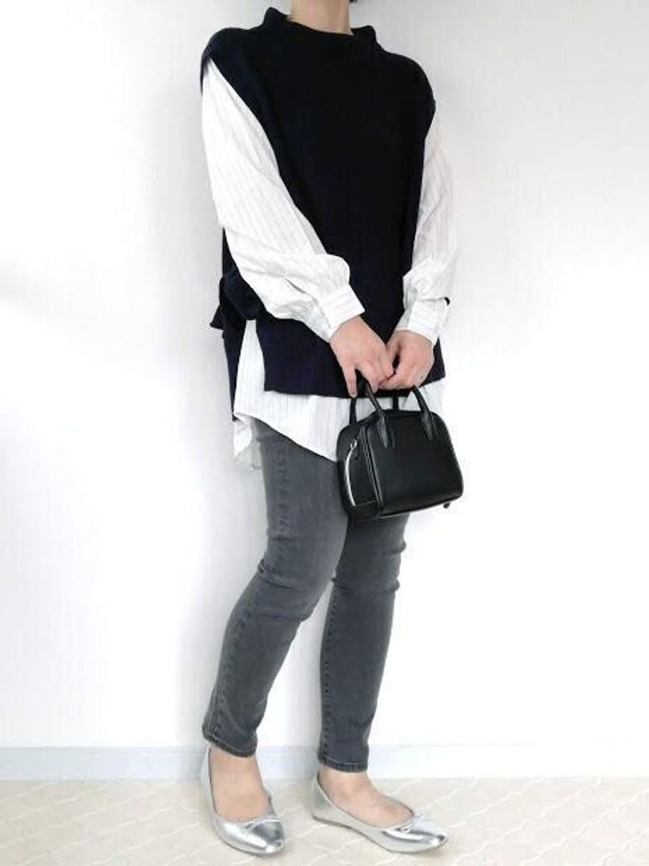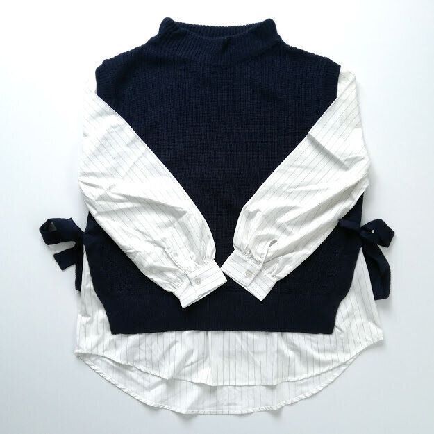 ニットベストにストライプのシャツをドッキングしたアイテム。シャツ部分は袖と裾のみで、かんたんにバランスよいレイヤードスタイルが完成!