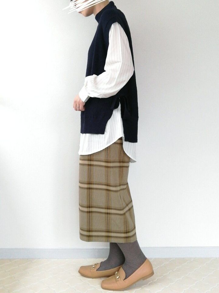 Iラインシルエットの長めタイトスカートで、さらに大人らしい印象に。