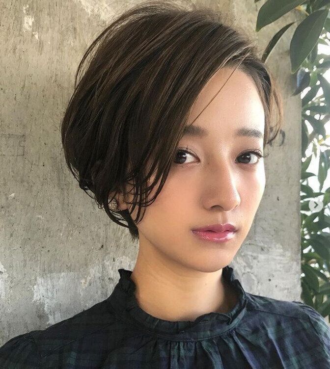 ショートにもボブにも見える万能なヘアスタイルは扱いやすく、イヤリングやピアスなどが映えます!また、前髪からサイドにかけてつくった後れ毛は、面長さんの顔をうまくカバーします。初めてショートスタイルにチャレンジしたい方におすすめのヘアスタイルです。