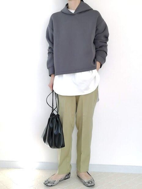 パーカー×スラックスできれいめカジュアルを狙ったスタイリング。ですが、寸足らずのように見えてしまいバランスが悪く、どこか「ちんちくりん」な印象……カジュアルアイテムを取り入れているのにおば見えになってしまいます。
