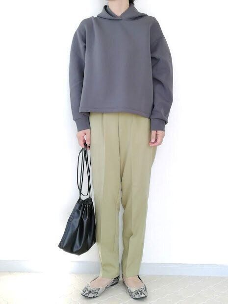 ハリ感があって、スタイリッシュに着こなせるのがおすすめポイント。フードに紐がついていないので、カジュアルになりすぎず大人っぽく見えるのも◎。