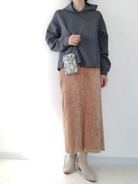 ワイドな短めトップスは、タイトスカートと合わせると大人っぽいバランスに。コーデュロイ素材のタイトスカートで、暖かみある秋冬コーデの完成!パイソン柄バッグでスパイスをひとさじ。