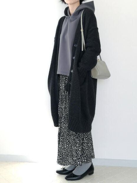 ロングスカート×ロングカーディガンでゆるっとしたスタイリングに。フェミニンなコーデに、パーカーのフードがほどよいカジュアル感をプラスしてくれます。