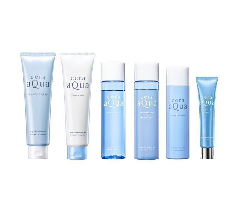 セラアクアの商品ラインナップは全7アイテム。「クレンジングジェル」ヌルつかないけど、落としたあとに潤い感を維持できるジェルタイプ。お風呂場で濡れた手でも使えるのがうれしいところ。「洗顔フォーム」は、すばやくきめ細かな泡が作れてこすらずに洗えます。こちらの2商品は洗顔後のお肌の潤い感に驚く洗い上がりです。「化粧水」はみずみずしい〈しっとり〉と、濃密なとろみが特徴の〈とてもしっとり〉の2タイプ。ゴクゴク浸透(※角層まで)が特長です。「乳液」は軽いテクスチャーで肌なじみ抜群、刺激から肌を守るヴェールとなるスキンプロテクト成分配合です。「潤いリフト クリーム」は、保湿・なじみのよさのため、Wコラーゲン配合で乾燥小ジワを目立たなくする(※効能評価試験済)のにもってこいのクリームで、ジャータイプではなくチューブタイプなので衛生的にもGOOD。そして、最初はお試しサイズでトライしたいという人のために、とてもしっとりの化粧水と潤いリフト クリームが5回分ずつ入った「スキンケアトライアルセット」もあります。