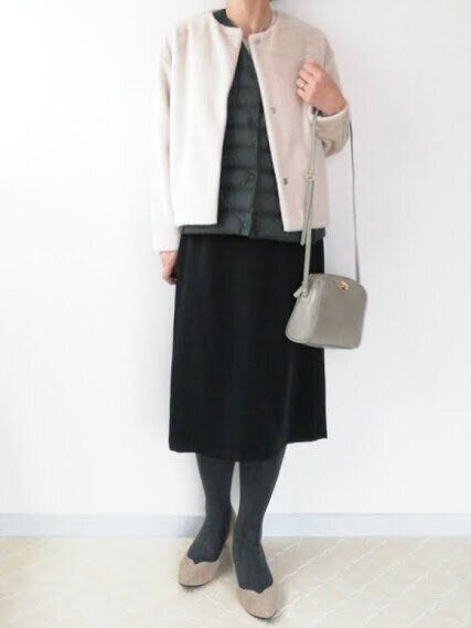 ボリュームあるボアアウターのインに。着ぶくれして見えがちなボアアウターも、コンパクトなインナーベストならすっきり見えますよ。袖がないベストは、腕まわりもモコモコしないので動きやすさもバッチリです。