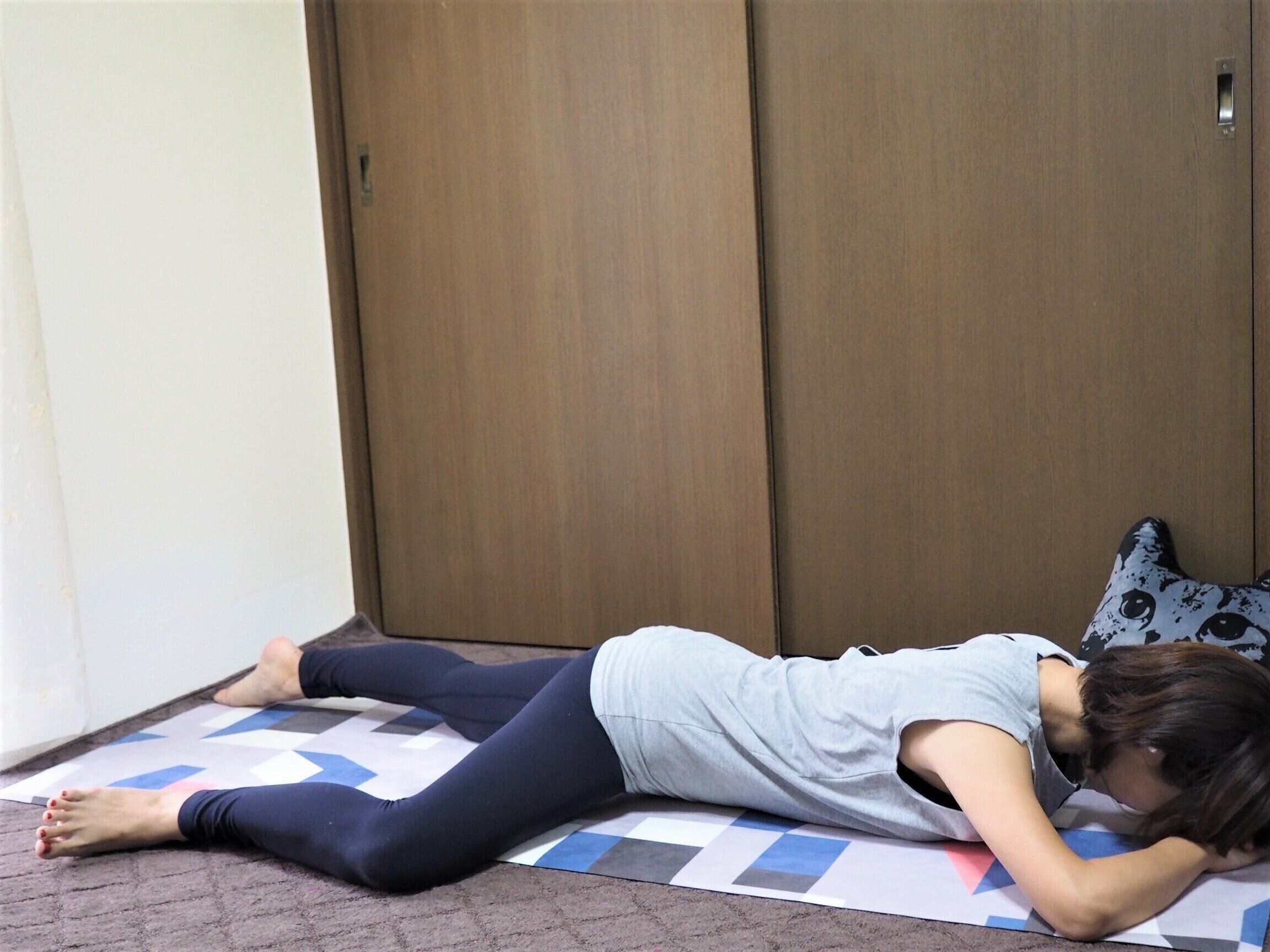 うつ伏せになり、骨盤が閉じているほうのひざを曲げ股関節の位置からさらに引き上げます~5回