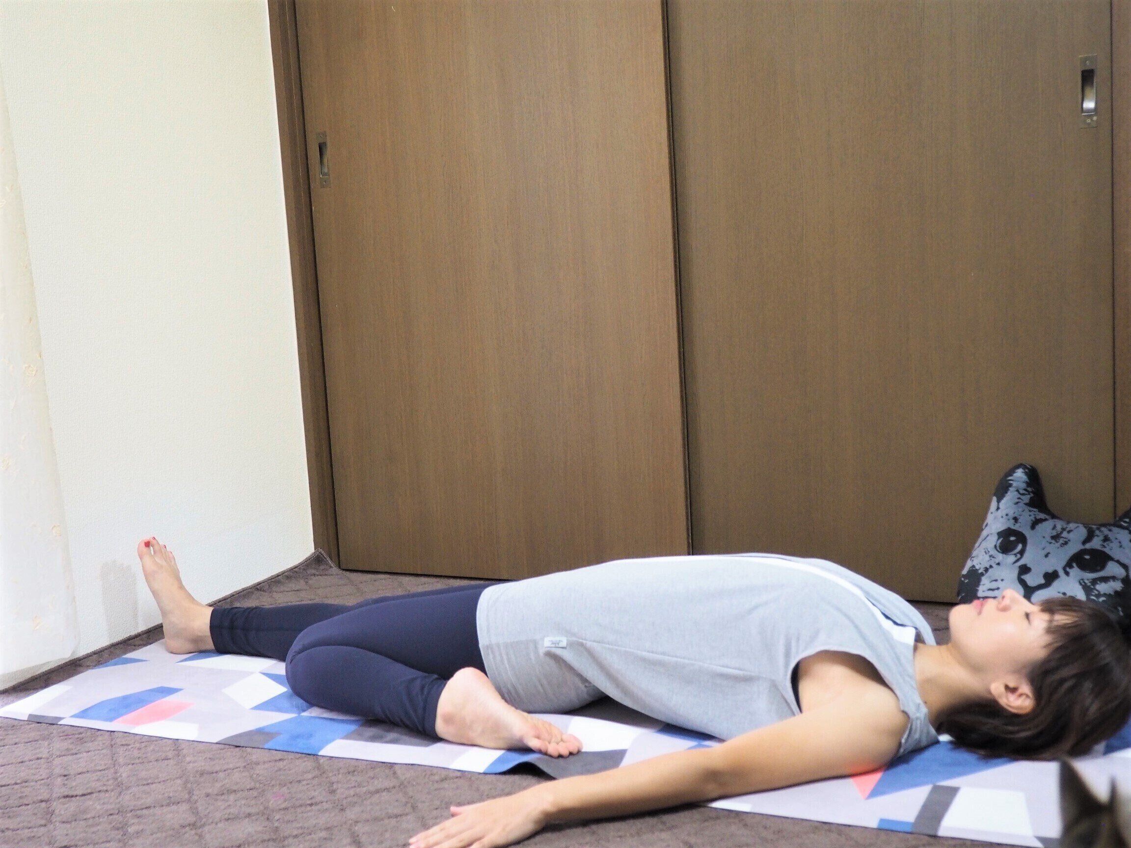 仰向けになり、骨盤が上がっている方のひざを曲げて伸ばします~5呼吸