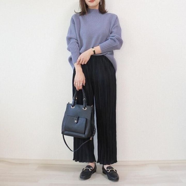 ニットとパンツがしまむら。トレンドのプリーツパンツは、黒を選べば大人らしく着こなせます。黒多めのコーデに、ニットのブルーがはっと目を引く冬コーデ。