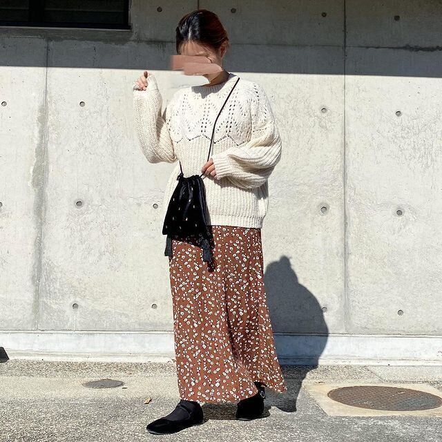 ニットとスカートがしまむら。透かし編みが大人かわいいニットに、落ち着いた花柄スカートを合わせて。子どもっぽくなりすぎないニットコーデの完成!黒のバッグ・靴ならコーデが引き締まって◎。