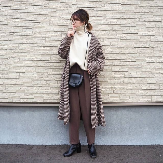 コートとパンツがしまむら。トラディショナルなチェックが高見えのコートは、なんと税込2,970円(Instagram投稿時点の価格です)!。ブラウンのきれいめパンツとクリーンな白ニットで、きれいめカジュアルな冬コーデ。