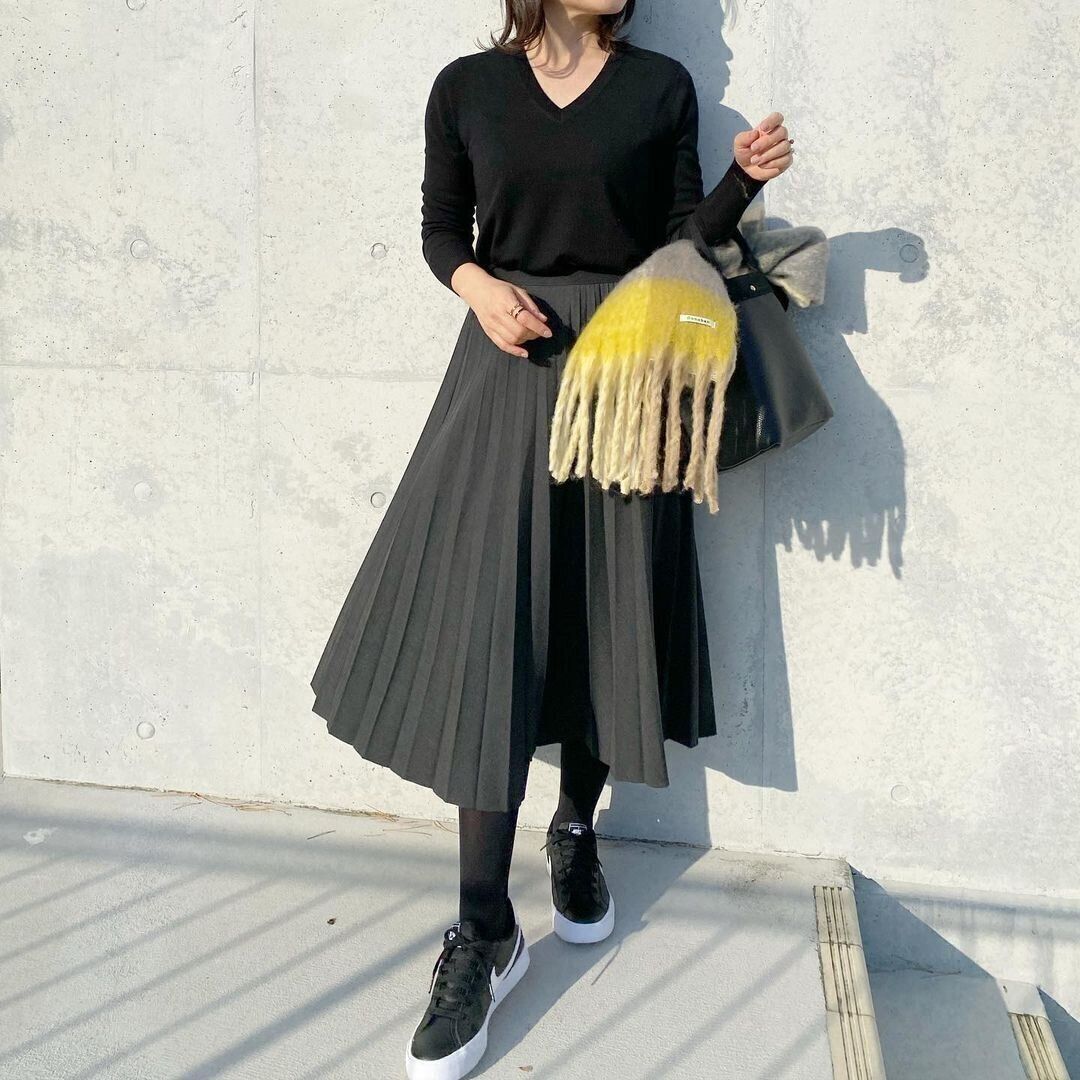 こちらは、「エクストラファインメリノVネックセーター」(2,990円)でつくったオールブラックコーデです。上質なメリノウールで作られたニットは、大人の女性こそふさわしいアイテム。ストールを差し色にすれば、オールブラックでも動きがつくれておすすめです。