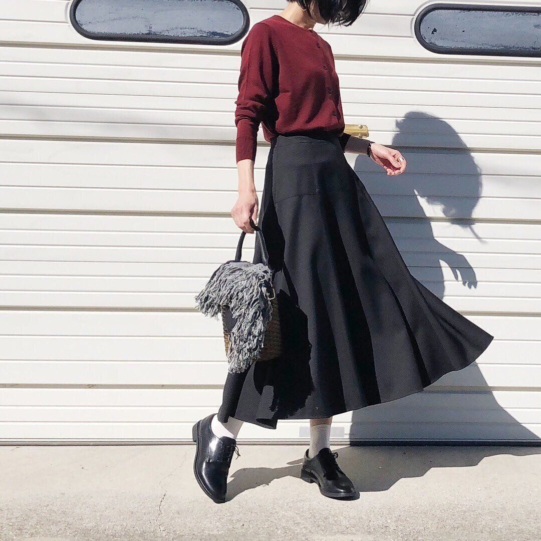 こちら着用されているカーディガンは、「エクストラファィンメリノクルーネックカーディガン」(2,990円)です。季節感漂うワイン色で、お手持ちのスカートに合わせるだけでサマ見えを叶えてくれます。ボタンを全部留めるとデザイン性がアップするカーディガンは、上半身も間延びせず着こなせる優秀選手なのです。