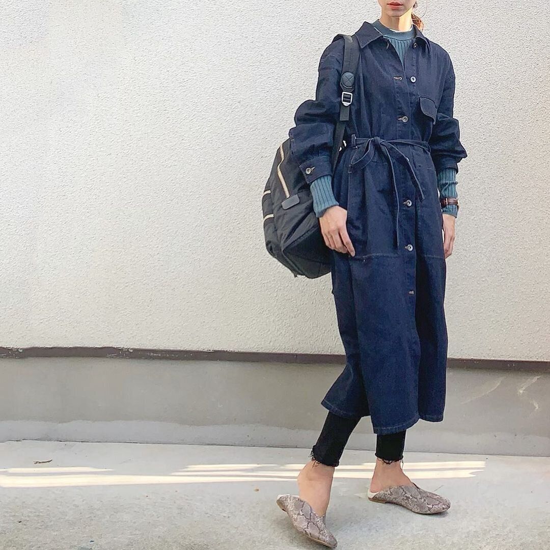 デニムシャツコートのインナーからのぞかせたニットが、「エクストラファインメリノリブクルーネックセーター」(1,990円)です。ほどよく薄手のリブニットなので、レイヤードのインナーにもぴったり!ネックラインが立ち上がっているので暖かくいられるのも便利です。リブの太さも絶妙で、華奢見え効果も得られるニットがこちら!