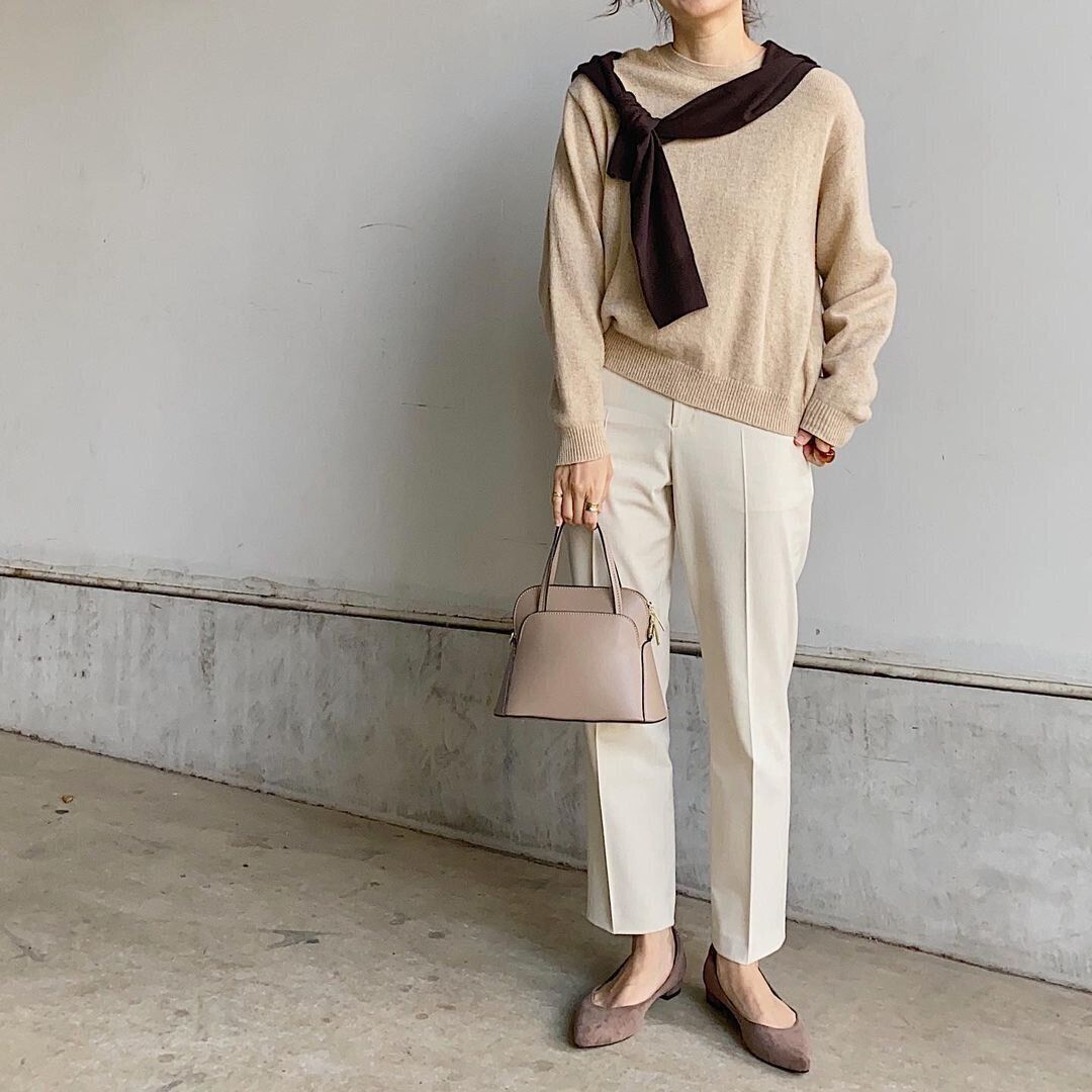 今年気になる「肩掛けスタイル」もシンプルなニットなら叶う