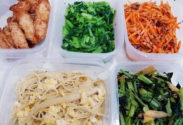 時間があるときは、お弁当のおかずにもなる常備菜を作り置きするようにしています。写真は、塩麹チキン、キャロットラペ、小松菜ナムル、小松菜とキムチのあえもの、グルテンフリーパスタサラダ。常備菜があることで短縮できた時間を、休んだり自分磨きしたりすることに使うのだとか。