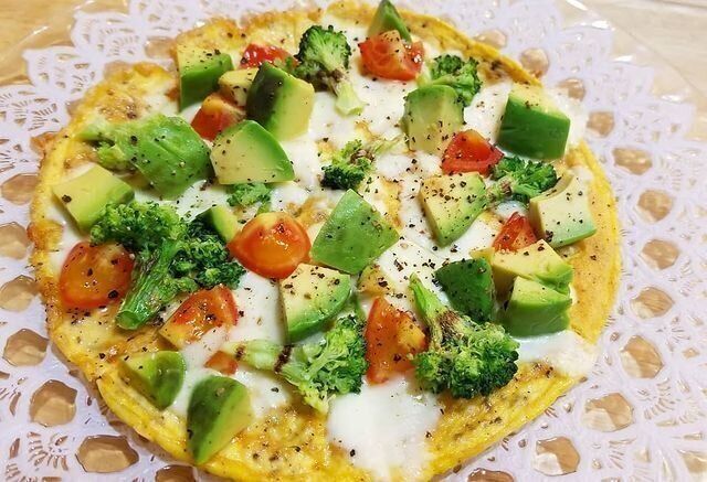 ある日の夜ごはんは、アボカド、トマト、ブロッコリーをたっぷりのせたピザ。ピザ生地を、卵とモッチァレラチーズでつくることで、低糖質・高たんぱくに仕上げています。フライパンで手軽につくれて、栄養もしっかりとれるのがうれしいですね。好みでキムチをトッピングしても◎。