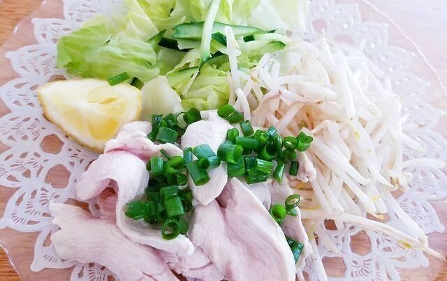 この日のランチは、ヘルシーな鶏胸肉のしゃぶしゃぶ。鶏胸肉を薄くスライスしてゆでるだけで、意外と簡単につくれます。もやし・レタス・きゅうり・小口ねぎを添えて、彩りやバランスもよい一品に。しょうゆ・おろしにんにく・レモン汁を合わせたタレにからめて食べるとおいしいそうですよ。