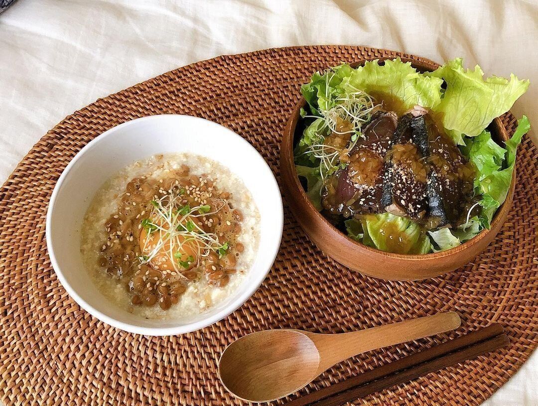 この日の朝食は、レタスを添えたかつおのたたきと、納豆卵かけご飯風に調理したオートミールでした。オートミールを納豆や冷蔵庫に残っていた豆腐でボリュームアップしているので、食べ応えバツグンです。卵黄とブロッコリースプラウトを乗せれば、より見栄えよく仕上がります。豆腐を入れずに、オートミールの量を増やしても◎。