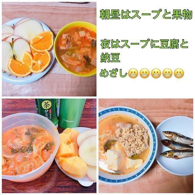 外食などでたくさん食べる予定があるときは、前日の食事をスープメインにして調整することも。果物や豆腐、めざしなどと上手に組み合わせているので、満腹感をしっかり感じられそうですね。