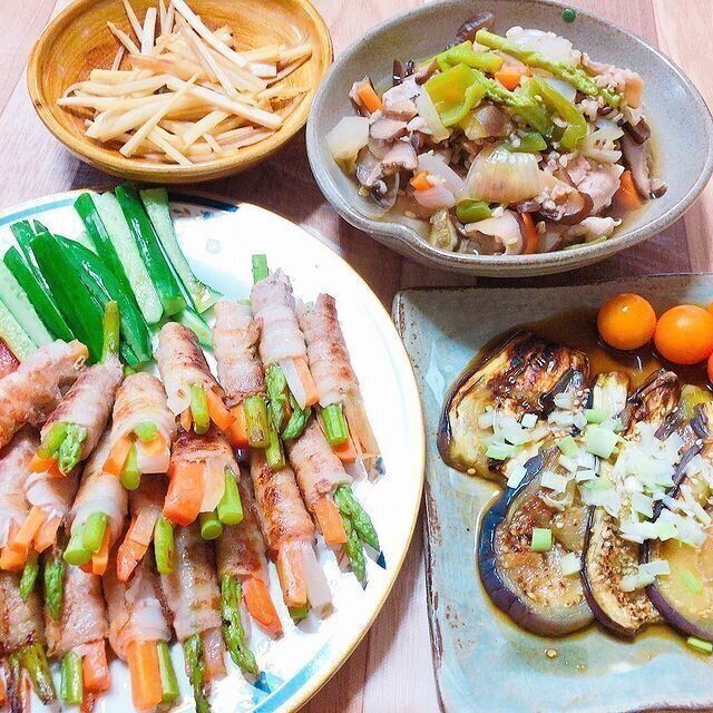 食事は、野菜中心のヘルシーな献立が基本です。この日の夕食には、なすの蒲焼き風、ニンジン・アスパラ・大根の肉巻きなど、いろいろな野菜を使ったメニューが並びました。彩り鮮やかな食卓で、気分も上がりそうですね。大根の皮はきんぴらにして、ムダなく活用しているのもポイント。