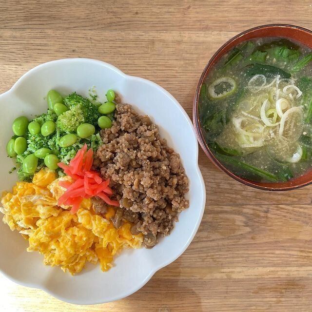 この日の昼食は、子どものお弁当に入れた鶏そぼろ。鶏ひき肉だけではなく、腸活のためにごぼうをプラスしているところがポイントです。かみ応えもあるので、お米をカットしてもしっかり満足感を得られます。
