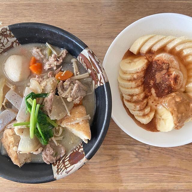 大好きなバナナヨーグルトは、この日の朝食にも取り入れています。前日の夕飯につくった、豚汁の残りといっしょに食べました。豚肉に含まれるビタミンB1には、糖質の代謝を助ける効果も期待できるのだとか。ダイエットを通じて食べ物の栄養について知識が増えたことで、食べ合わせを意識して食べるようになったといいます。