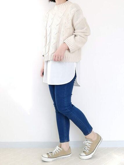同じケーブルニットなら、インしやすいショート丈のものがおすすめ。もたつかずにインできるので、無理せずすっきりと見せることができて◎。